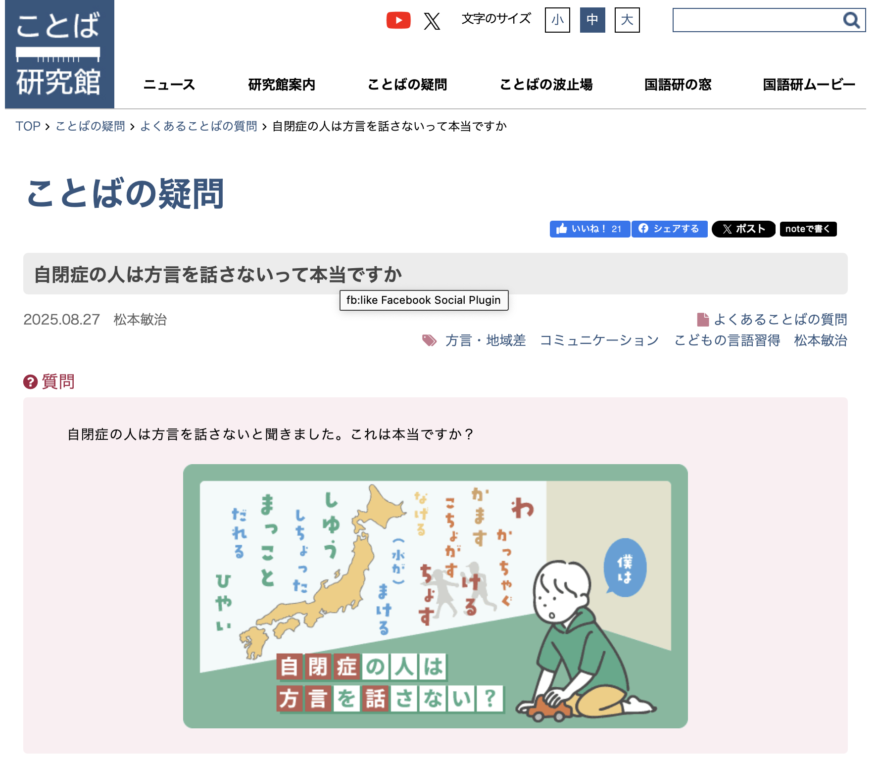 国立国語研究所のサイトにWeb記事を書きました。タイトルは「自閉症の人は方言を話さないってほんとうですか」です。