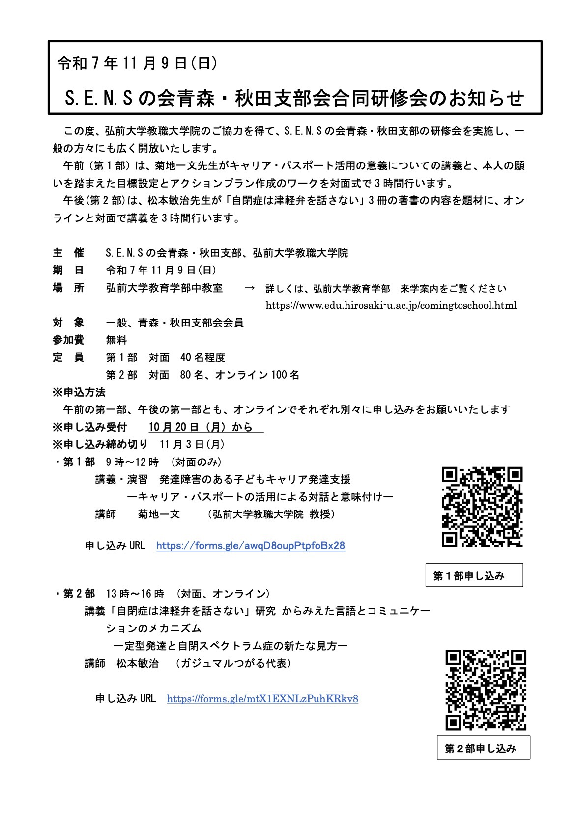 S.E.N.Sの会青森・秋田支部合同研修会で講師を務めます。