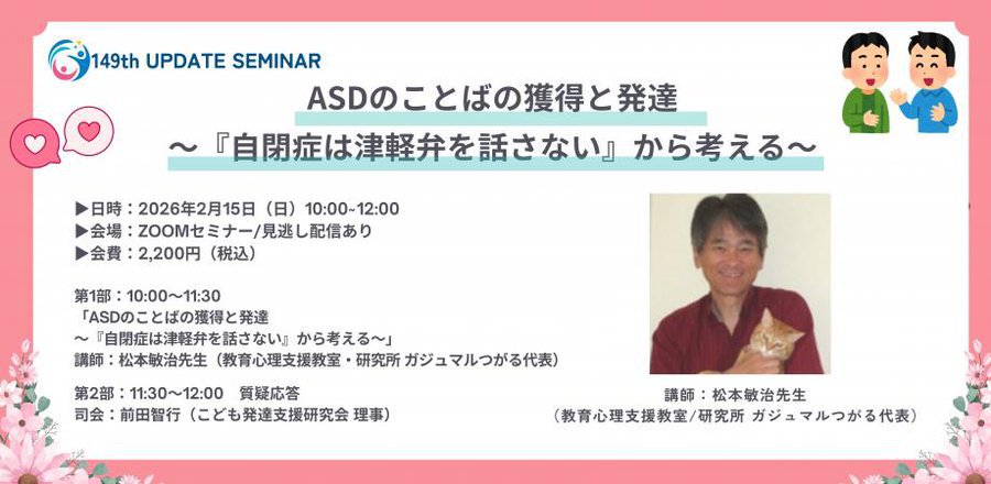 2月15日(日)に「自閉スペクトラム症(ASD)の言葉の獲得と発達〜『自閉症は津軽弁を話さない』から考える」というテーマで講演(Zoom)をいたします。(画面をクリックすると申込みURLへ移動します。)